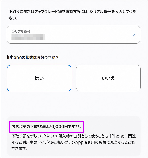 手続きは非常に簡単で、端末のシリアルナンバーと端末の状態を入力するだけで下取り額の基準額がすぐにわかります。