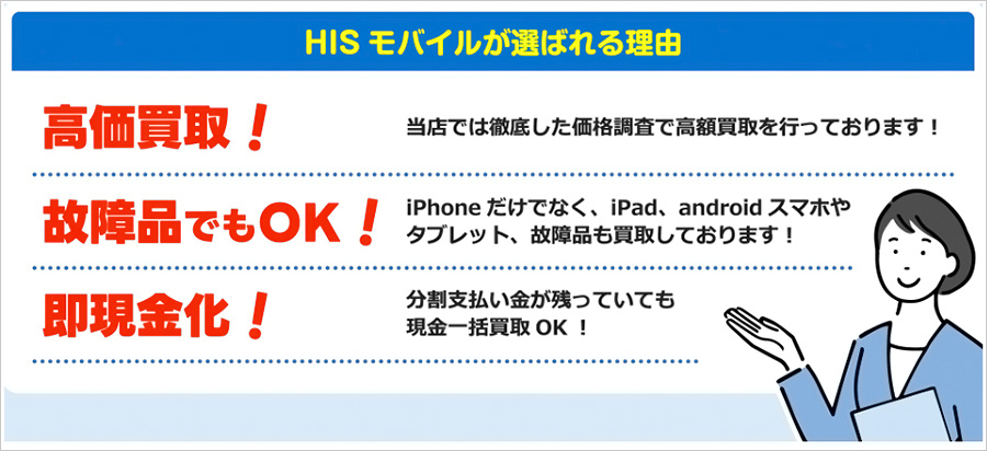 HISモバイル銀座店への持込みで、iPhoneをはじめ各社スマホを高価買取り可能です。故障品でも買取可能なので他所で査定が付かない場合でも相談してみる価値ありです。