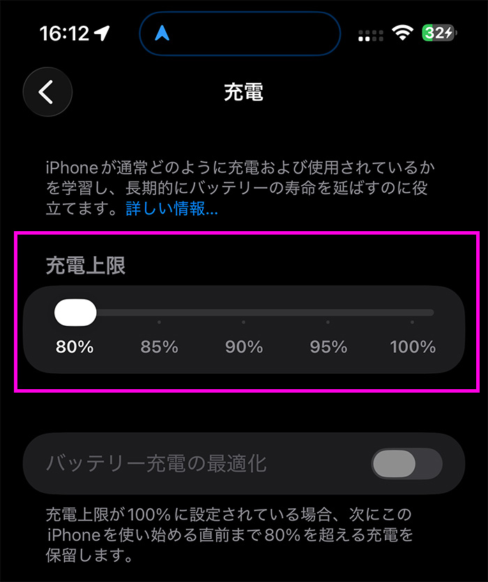 充電上限を定めておける機能がある場合は、あらかじめ100%よりも低い容量を上限に設定しておきましょう。